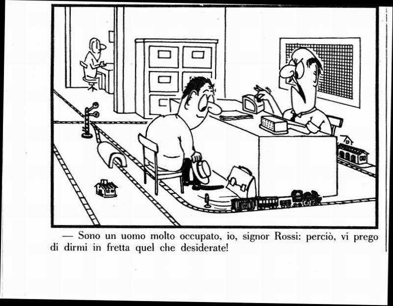- Signor Capostazione, insomma, il treno che dovevo prendere ha già un ritardo di mezz’ora! - Non si preoccupi, signore, il suo biglietto è valido per tre giorni. |