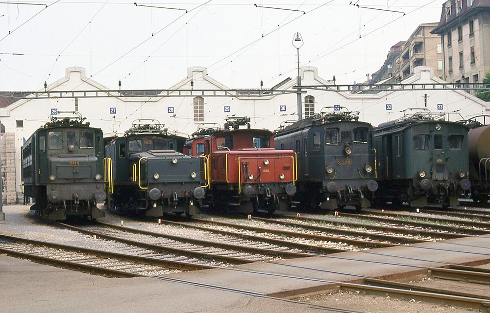 Non si tratta di locomotive storiche ma di veterane ancora in servizio presso il deposito di Losanna nel luglio 1977. Da sinistra a desta: Ae 3/6' 10697, Ce 6/8" 14275, Ee 3/3" 16514, Ae 3/5 10216, De 4/4 1678. (Foto: André Knoerr) |