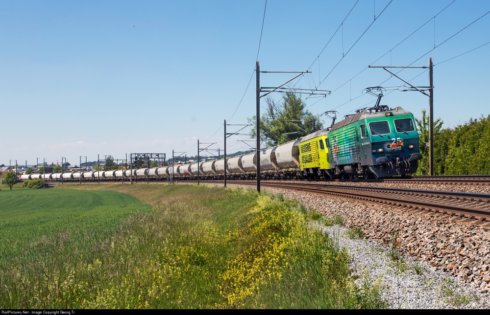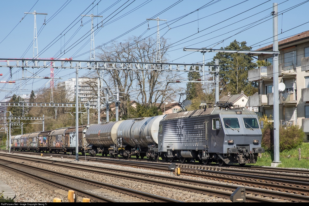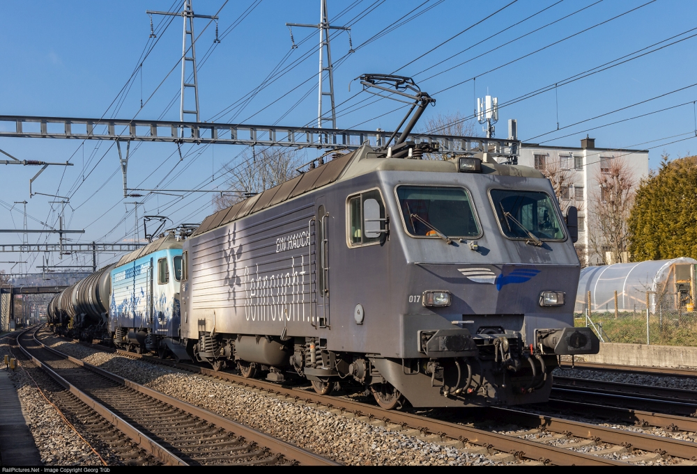 Nella foto seguente, 8 febbraio 2023. Le locomotive Re 446 n. 017 e n. 018 in multitrazione trainano un convoglio cisterne-benzina di circa 1800 tonnellate, il 44661, da Grosskorbetha/Germania via Basilea-Bözberg-Regensdorf-Kloten-Wil SG fino a Bettwiesen (deposito di carburante di Tägerschen), tra Winterthur e Winterthur Grüze.