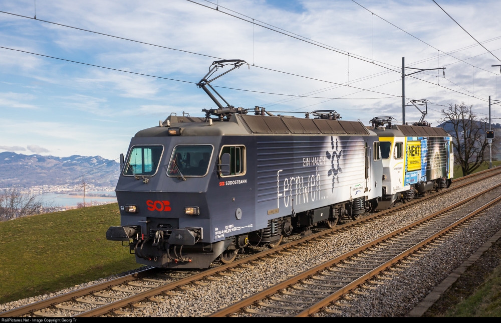 Nella foto seguente, il 31 gennaio 2020, le ex locomotive della Südostbahn Re 446 n. 017 (con la livrea pubblicitaria Voralpen-Express "Ein Hauch Fernweh...") e n. 015 (con la livrea pubblicitaria per la mostra NEAT presso il Museo Svizzero dei Trasporti di Lucerna) sono state consegnate al nuovo proprietario, la Eisenbahndienstleister GmbH (EDG). Le locomotive sono impegnate in una corsa di collaudo da Samstagern a Biberbrugg e ritorno, sulla pendenza del 5% tra Schindellegi-Feusisberg e Samstagern, con il lago di Zurigo sullo sfondo.