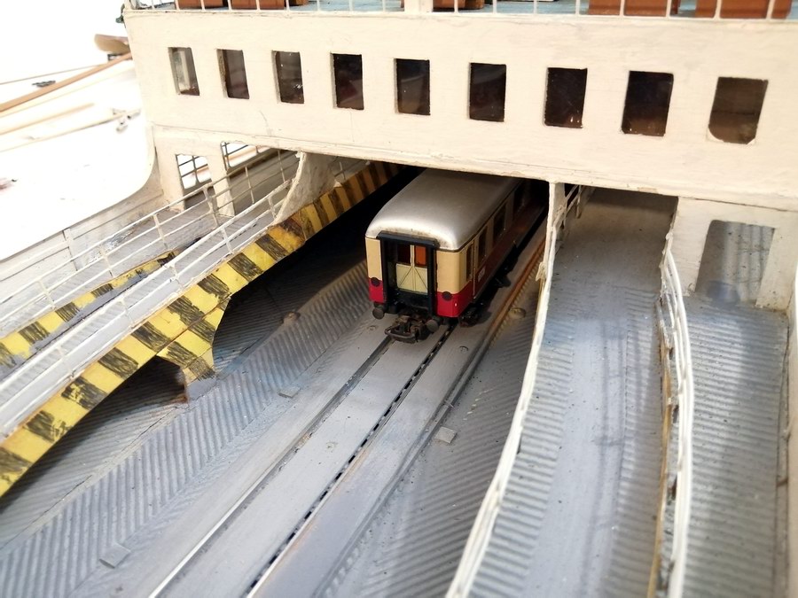 Ieri si è fatto il primo esperimento per valutare la fattibilità di un piccolo terminal traghetti che si cercherà di realizzare in tempi brevi. Il traghetto che il museo ha ricevuto in donazione verrà restaurato, modificato, illuminato, e attrezzato con un binario che sarà stabilmente collegato a uno degli attuali binari presenti sul molo. In questo modo sarà possibile simulare l'operazione di carico/scarico di un convoglio formato da almeno tre vetture passeggeri a carrelli o da carri merci. Il binario del traghetto non sarà alimentato perchè l'operazione verrà effettuata con macchine che spingeranno un carro pianale scudo che farà restare la macchina sempre all'esterno del traghetto.