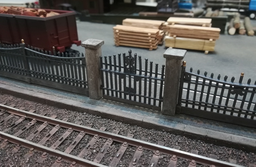 Lavori in corso per la delimitazione dell'area della segheria. Cancellate Noch 13100 e pilastri realizzati con listello di legno verniciati con colori acrilici e trattati con polvere di cemento prima dell'asciugatura.