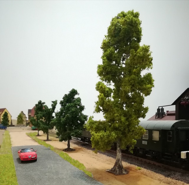 Prime prove di realizzazione del viale di accesso al paese. Tutti gli elementi decorativi sono provvisori. Nella soluzione definitiva ci saranno alberi da 18 cm. di altezza, staccionata ferroviaria, illuminazione pubblica, paracarri e segnaletica.