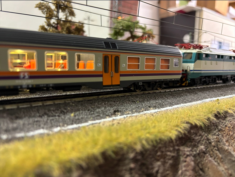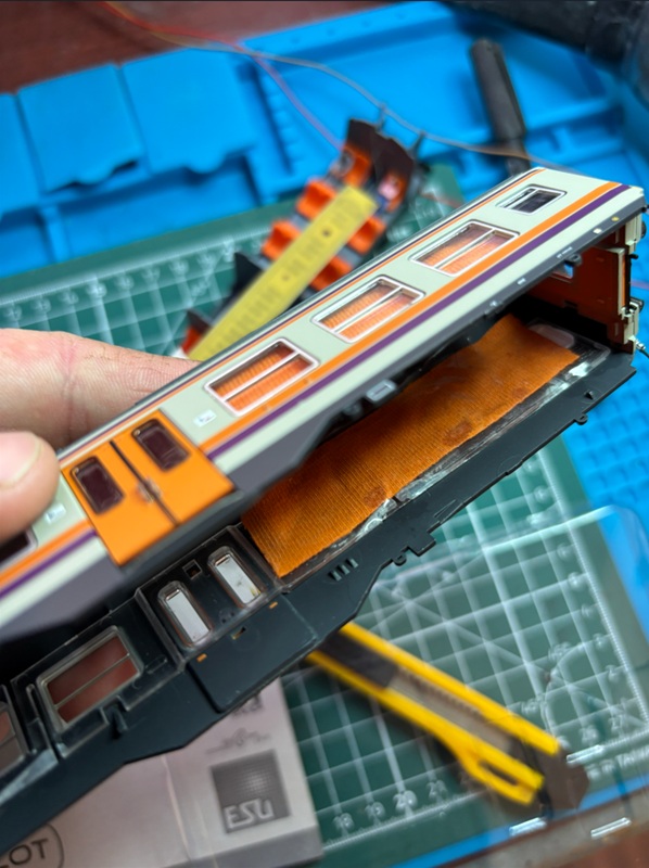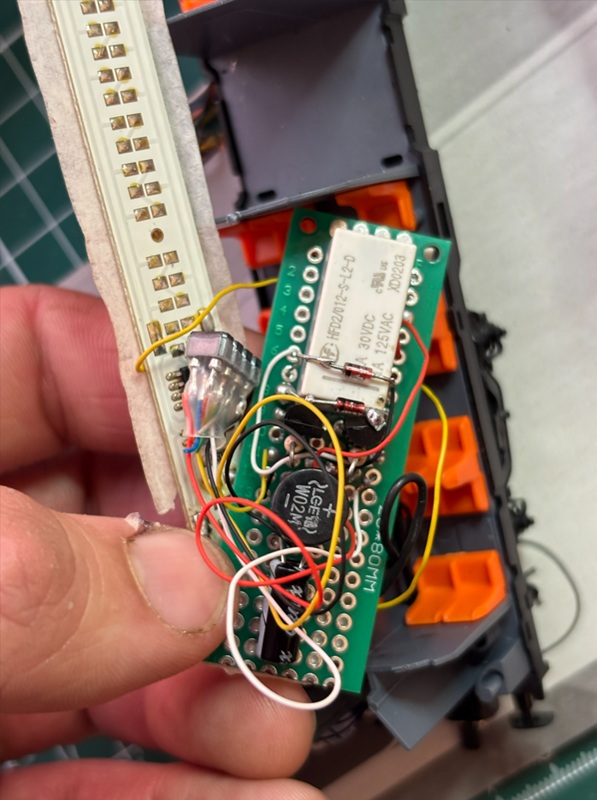 sotto al vano relè c'è il pattino che prende corrente per la marcia in avanti. il treno è dotato di ganci conduttori almrose a due poli. Dalla parte delle altre carrozze un polo serve a trasportare la corrente captata dal pattino della pilota, mentre l'altro polo alimenta tutto il treno, fino alla pilota e relativo decoder. lato locomotiva invece il gancio porta la stessa alimentazione comune alla loco, che quindi non necessita di avere un pattino. Una scelta un po' drastica ma che rende anche più semplice l'utilizzo di macchine non predisposte al Nostro sistema. Soprattutto la mia D445 Lima, ha giovato particolarmente della rimozione del pattino, visto che lo digeriva a fatica. Col Lokprogrammer ho potuto finalmente rendere indipendente dall'accensione delle luci il cambio di alimentazione, e ho voluto anche mettere un cutoff a 2 secondi, così le bobine non vengono inutilmente alimentate dopo la commutazione. Per fare questo consiglio di mettere il decoder su una presa prima di metterlo sul circuito perché il passaggi dal transistor rende il lavoro di programmazione un po' più lungo. Probabilmente il relè introduce disturbi alla comunicazione.