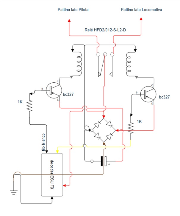 Vista l'occasione di averci messo mano, ho decisa di parlare di come ho realizzato un treno con alimentazione dipendente dal senso di marcia. Tra le molte cose di cui mi sono innamorato da bambino sfogliando i cataloghi Marklin, era proprio questa. Poi diciamolo, quando facciamo un bel treno navetta, lo si vuol vedere andare anche in spinta, soprattutto se c'è un bel segnale sotto il quale si deve fermare... E' quindi partito un viaggio che tra attese, momenti sabbatici, decoder bruciati e calendari tirati giù è durato circa un anno, e solo oggi posso dire di essere riuscito pienamente nel risultato. Il primo tentativo è stato fatto usando una scheda esu, questa ha un relè commutabile grazie alle uscite aux3 e 4, ma non ha funzionato perché non avevo il lokprogrammer per configurare il decoder. sicchè ho provato a collegare le uscite luci di un decoder direttamente al relè di quella scheda, decoder immolato per la vittoria che è durato pochi giri di plastico... pertanto ho deciso di partire con un piede diverso. ho trovato un relè bistabile abbastanza piccolo per i nostri scopi, che sopporta fino a 24v di tensione di commutazione, perfetto. ho poi realizzato un circuito con due transistor per poter pilotare in tranquillità le bobine, il Datasheet dava un consumo delle stesse di 200 mA, ma non mi son fidato. I transistor sono pilotati dalle uscite luci, così non mi sarei dovuto preoccupare troppo di mappare le uscite