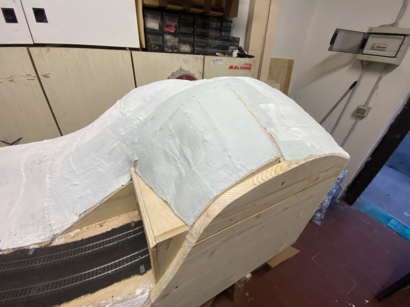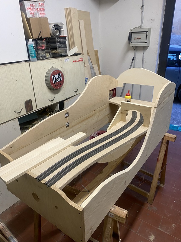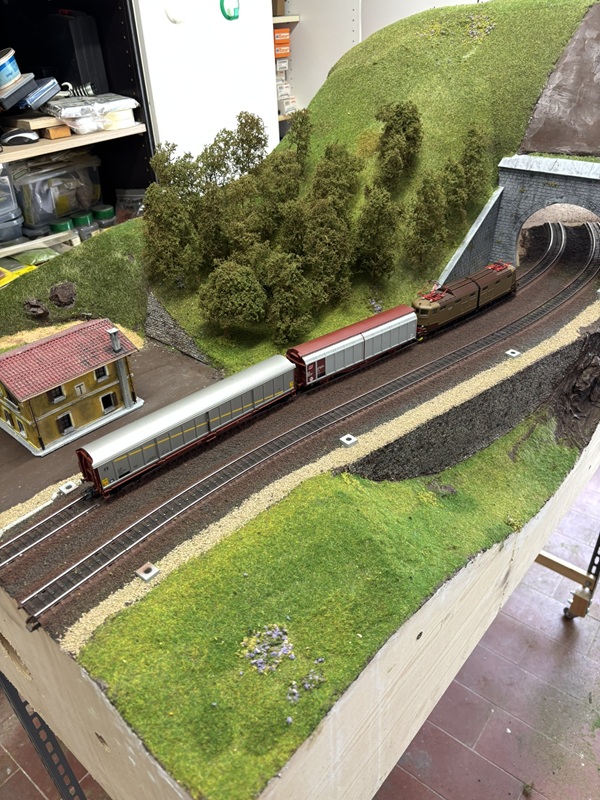 Come ho scritto nel post sul modulo di mio Padre (intitolato "Modulo di Carlo Reloaded") la rimessa in funzione dello stesso non è solo fine a sé stessa ma fa parte di un progetto più ampio di plastico casalingo. L'intenzione è quella di costruire un tracciato intorno all'opera di Carlo che sia una versione in piccolo delle esposizioni in fiera. Una linea di parata chiusa tra due gallerie con delle parti nascoste di servizio fondale ecc. Volevo però che non fosse solo un banale rettilineo, e non ho fisicamente lo spazio per poter inserire curve ad ampio raggio, inoltre ho l'esigenza di rendere l'ingombro in profondità il minimo possibile, avendo un fondo stretto e lungo. da qui ho partorito l'idea di fare una galleria un po' diversa dalle classiche portate in fiera, con più respiro. da qui nasce l'idea della Galleria del Bosco (nome partorito dopo grandi sessioni di brainstorming e dalla spiccata originaltà ) ho iniziato a Ottobre dell'anno scorso e sono in avanzato stato di completamento.