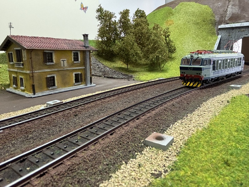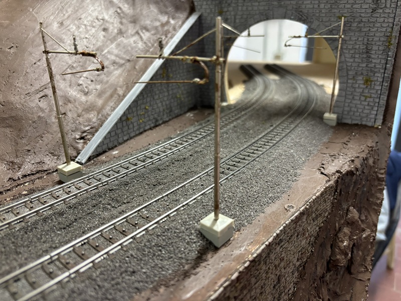 Volevo menzionare il sistema di ancoraggio dei pali. Inizialmente ero partito coi classici Viesmann tedeschi, però non mi hanno mai convinto fino infondo, pertanto ho deciso di andare sui Sommerfieldt M. Essendo però in fase di costruzione ho preferito realizzare i plinti su misura in stampa 3d per rialzare i pali e portarli all'altezza giusta per avere la catenaria a 70 mm dal piano di ferro. In foto ho messo dei pali che aveva montato Papà che richiedono urgente restauro prima del montaggio definitivo, ma rendono l'idea della resa.