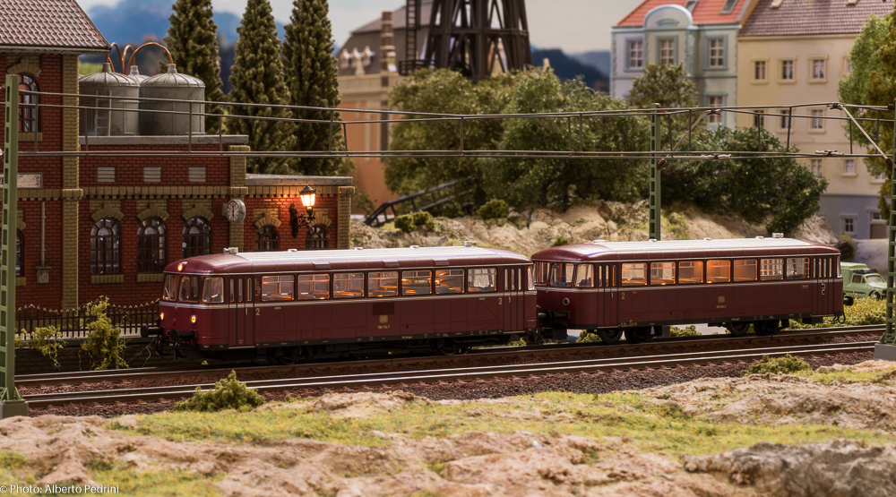 E' evidente la differente altezza tra i veicoli; il tetto delle "Schienenbus" è all'altezza del "muso" della 211.