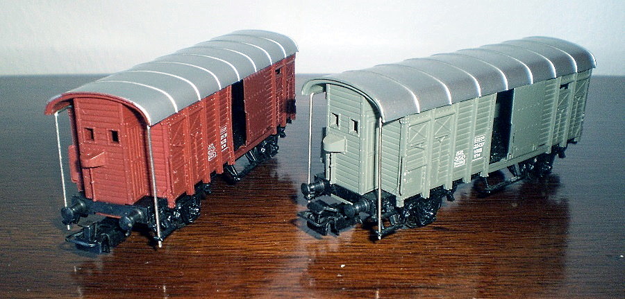 Sul finire degli Anni '50 i carri di colore grigio destinati ai treni merci convenzionali, vennero ricolorati con la livrea bruno-rosso ossido, mentre quelli destinati ai treni espressi ricevettero la livrea verde. - Set di 3 carri K3 di Epoca III con 3 differenti livree - (Articolo Märklin 46568)